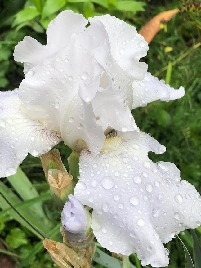 The fragrance of ‘Immortality’ reblooming iris drifts through the garden from the white, rain-soaked petals.